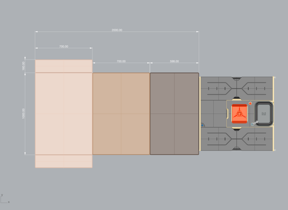 Úložné prostory pod HPL deskou kuchyňského modulu jsou vhodné například na skladování potravin. K organizaci a zajištění nákladu v nich slouží mobilní přepážky. Modul je při vysunutí umístěn níž než tomu bylo u Nestboxu a lze jej proto využít i jako jídelního stolu. Grafika na horních deskách naznačuje čtyři prostřená místa. Desky lze také otočit a využít milého detailu: z druhé strany fungují jako plochy pro deskové hry.